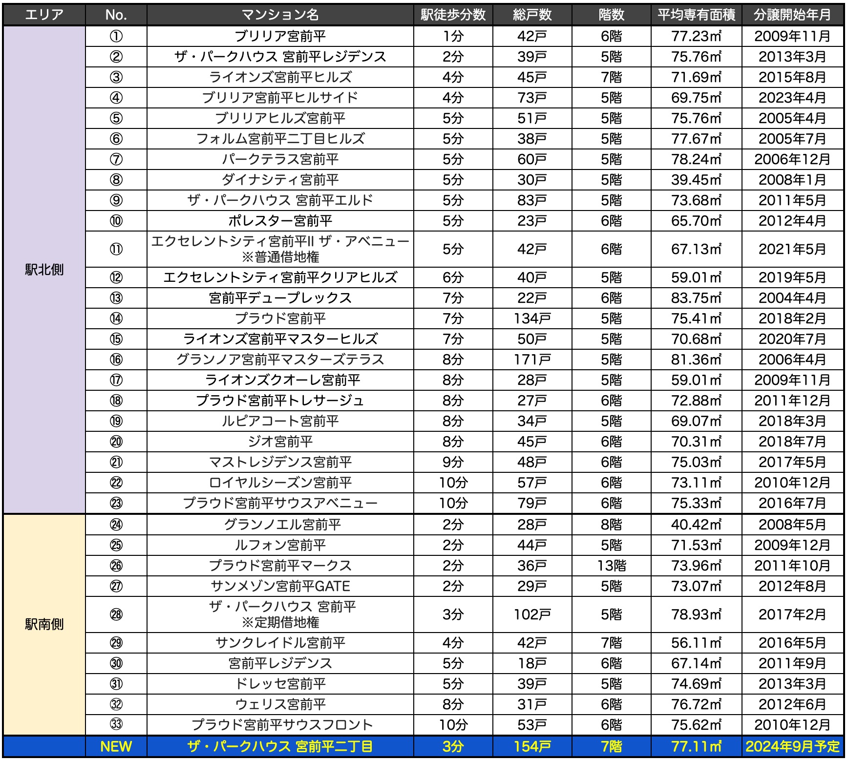 駅近物件は多い一方で、総戸数100戸を越えるのは3物件のみとなり、大規模マンションが少ないエリアです。駅徒歩5分圏内かつ総戸数100戸以上の条件を満たすマンションは、駅南側のザ・パークハウス宮前平(定期借地権)だけとなります。北側エリアにおいては該当する供給実績がなく、駅近×大規模の条件を満たす用地取得のハードルの高さがうかがえます。
